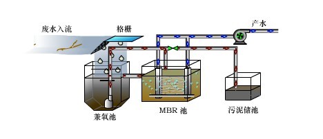 膜生物反应器(MBR)工艺是膜分离技术与生物技术有机结合的新型废水处理技术。它利用膜分离设备将生化反应池中的活性污泥和大分子有机物质截留住,省掉二沉池。活性污泥浓度因此大大提高,水力停留时间(HRT)和污泥停留时间(SRT)可以分别控制,而难降解的物质在反应器中不断反应、降解。